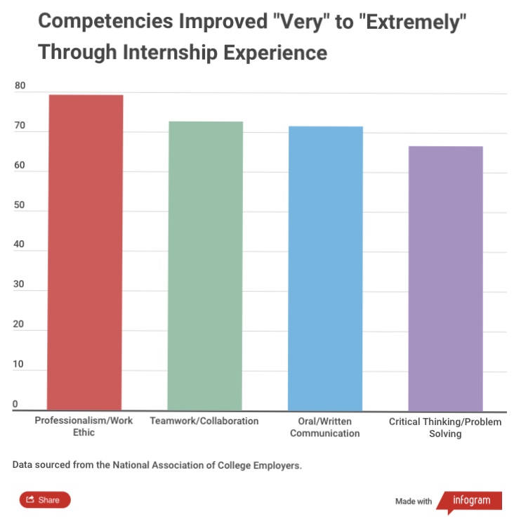 Additionally, NACE reported that 98% of employers deem that teamwork is very to extremely essential in a new hire and 85.1% of employers rate students as very/extremely proficient in teamwork competency. Teamwork can be learned in class through group projects, but is accentuated in a professional environment because the stakes are raised. Even 72.6% of students with internships reported that their teamwork and collaboration competencies were “very” to “extremely” improved from their experiences.